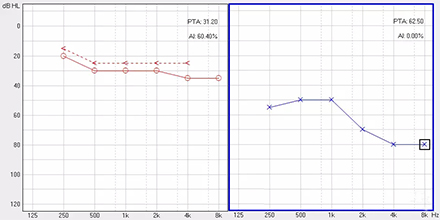 <span style="font-size:16px;"> 純音聽閾測試是聽力學所有測試項目中最基本的一項內容,包括氣導(AC)、骨導(BC)、最舒適閾(MCL)與不舒適閾(UCL)測試。測試結果能夠直接反映患者雙耳的聽力損失程度、性質與動態范圍,還能夠間接反映患者的患病位置、病因與助聽后效果。</span></p><p><span style="font-size:16px;"> 一般地,整個檢查控制在10分鐘左右,既能全面做完檢查,又不至患者疲憊而影響主觀反應。</span></p><p><span style="font-size:16px;"> 純音聽閾測試是最考驗聽力學工作者實際工作能力的一項基本內容:</span></p><p><span style="font-size:16px;"> 1、若患者曾長期暴露于噪聲中,且無其它致使聽損因素,很可能在3 kHz或6 kHz出現明顯的下降,聽力曲線呈現“V”字形,所以除了常規的倍頻程頻率外,還要加測這兩個頻率,否則就犧牲了多通道助聽器的意義;</span></p><p><span style="font-size:16px;"> 除了有過噪聲接觸史的患者需要加測半倍頻程外,涉及聲場助聽聽閾評估、賠償等情況都需要加測半倍頻程。</span></p><p><span style="font-size:16px;"> 耳鳴困擾的患者,注意避免與耳鳴聲類似的純音,若還用純音作為刺激聲,患者就會分辨不清,出現假陽性或假陰性。所以,測試者要換成囀音,既有別于耳鳴聲,又具有頻率特異性。</span></p><p><span style="font-size:16px;"> 2、不舒適閾反映患者對大聲的忍耐力,不舒適閾與氣導的差值能顯示患者的動態范圍,指導驗配師調節助聽器的最大輸出。</span></p><p><span style="font-size:16px;"> 不舒適閾測試頻率是否越多越好呢?非也。測得頻率過多,一會引起患者疲勞或不適,二是沒必要,大多數助聽器的最大輸出是一個整體,不能像調增益和壓縮那樣分通道,所以測多了并無好處,一般測0.5、1、2、4 kHz。</span></p><p><span style="font-size:16px;"> 3、如果兩側聽力有明顯差異,此時就要準備好掩蔽了,分為氣導掩蔽與骨導掩蔽。</span></p><p><span style="font-size:16px;"> (1)氣導掩蔽的判斷有兩個原則,只要符合其中一個原則,就需要重新測差耳氣導。具體做法是:</span></p><p><span style="font-size:16px;"> 測試完雙耳氣導,若發現某一頻率差耳氣導閾值比好耳氣導閾值多40 dB以上就要懷疑有可能是好耳偷聽的,需要給好耳氣導加掩蔽聲;</span></p><p><span style="font-size:16px;"> 測試完雙耳氣導與好耳骨導,若發現某一頻率差耳氣導閾值比好耳骨導閾值多40 dB以上就要懷疑有可能是好耳偷聽的,需要給好耳氣導加掩蔽聲。</span></p><p><span style="font-size:16px;"> 下面為未掩蔽的聽力圖:</span></p><center><span style="font-size:16px;"><img alt="" src="/upfiles/201809180234471614.png" width="440" height="220" /></span></center><p></p><p><span style="font-size:16px;"> 下圖為掩蔽后的左耳真實氣導值:</span></p><center><span style="font-size:16px;"><img alt="" src="/upfiles/201809180234541797.png" width="440" height="220" /></span></center><p></p><p><span style="font-size:16px;"> (2)骨導掩蔽的判斷原則:</span></p><p><span style="font-size:16px;"> 測試完雙耳氣導與好耳骨導,若發現某一頻率差耳氣導閾值比好耳骨導閾值大于等于15 dB就必須予以掩蔽,重測骨導。下圖為右耳氣導加掩蔽后左耳骨導的真實值:</span></p><center><span style="font-size:16px;"><img alt="" src="/upfiles/201809180235004928.png" width="440" height="220" /></span></center><p></p><p><span style="font-size:16px;"> 注意:</span></p><p><span style="font-size:16px;"> 1)掩蔽的規則要按順序適用;</span></p><p><span style="font-size:16px;"> 2)各頻率根據規則決定是否需要加掩蔽;</span></p><p><span style="font-size:16px;"> 3)很少需要掩蔽所有頻率,通常氣導掩蔽頻率不應超三個,骨導掩蔽頻率不應超兩個,否則受試者會疲憊不堪。</span></p><p><span style="font-size:16px;"> 醫院測聽的主要目的是診斷和鑒別聽力損失的性質和程度,驗配中心的主要目的是盡可能地幫助患者選擇并調試好助聽器。</span></p><p><span style="font-size:16px;"> 更多詳情請登錄m.cqzzjd.cn</span></p>" />