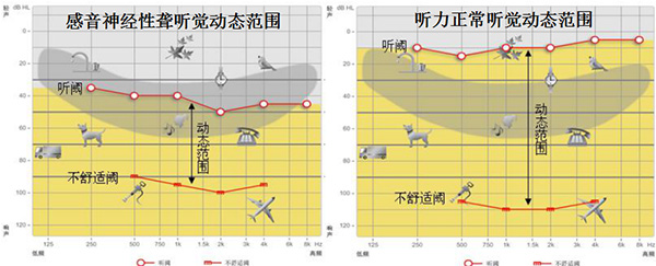 正常聽力者的不舒適閾約為130dB SPL,而聽力損失者,尤其是感音神經性患者往往對大聲特別地敏感,其顯著特征之一就是動態范圍變窄,表現為“小聲聽不見,大聲又覺吵”,即重振。