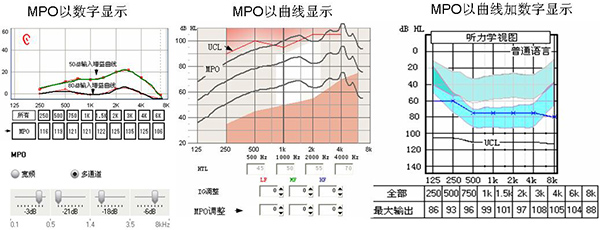 不同助聽器廠家軟件上最大輸出的顯示各有不同,有以數字顯示的,有以曲線顯示的,還有以曲線加數字形式表示的,但調試的方法均是將助聽器的最大聲輸出設置為不大于助聽器佩戴者的不舒適閾值。