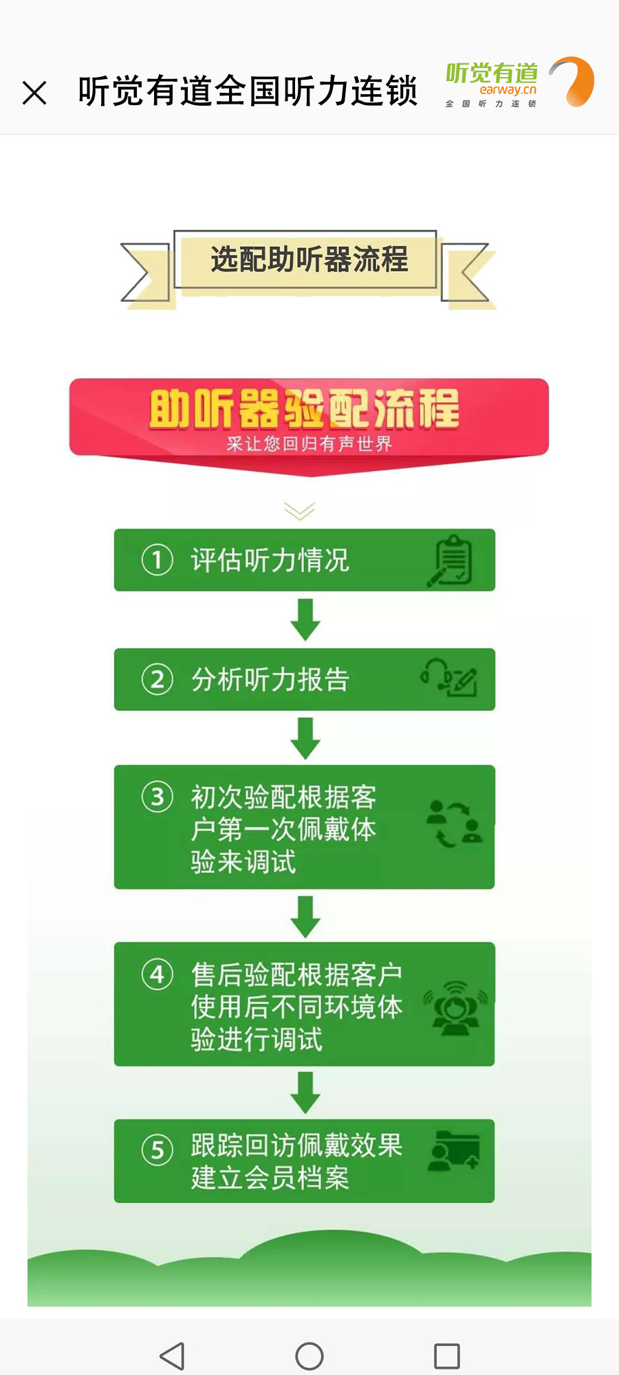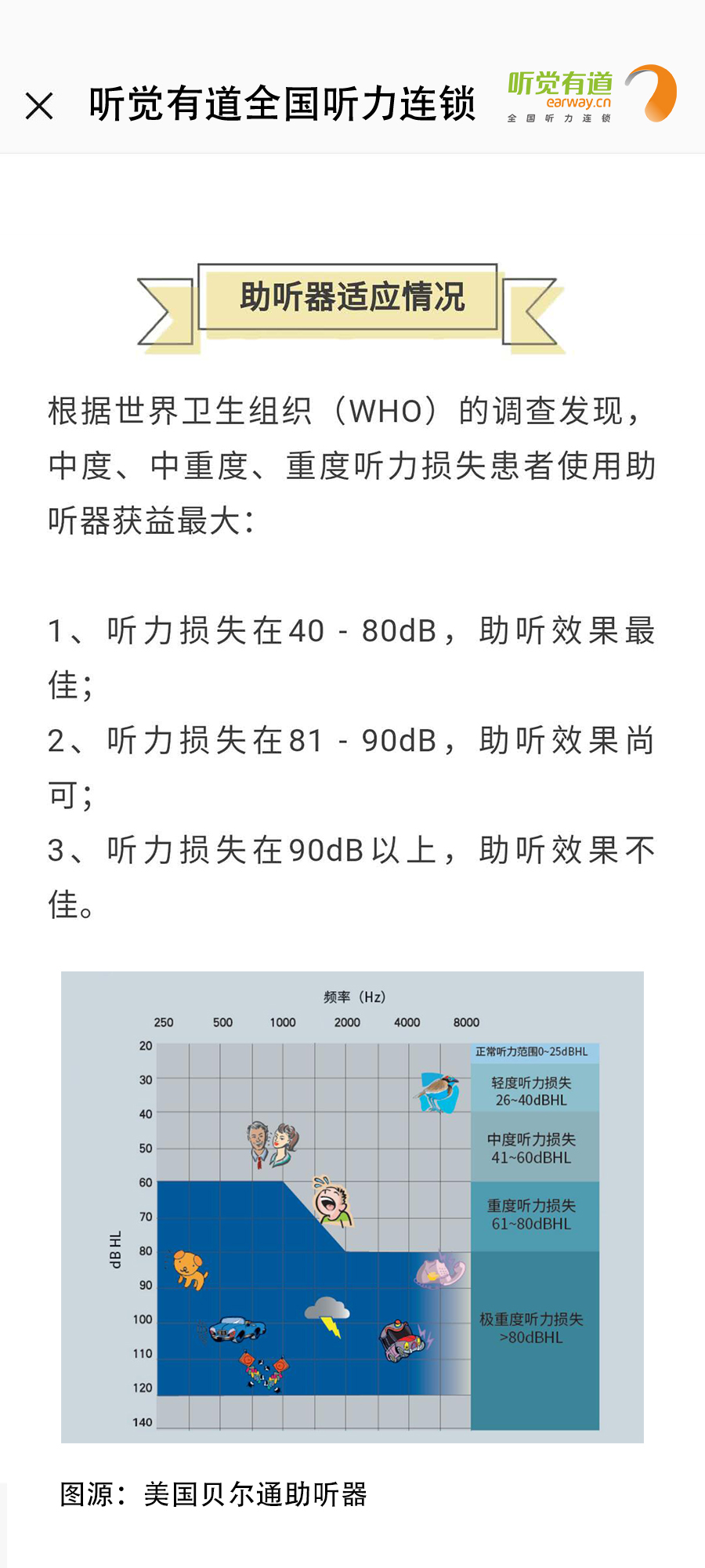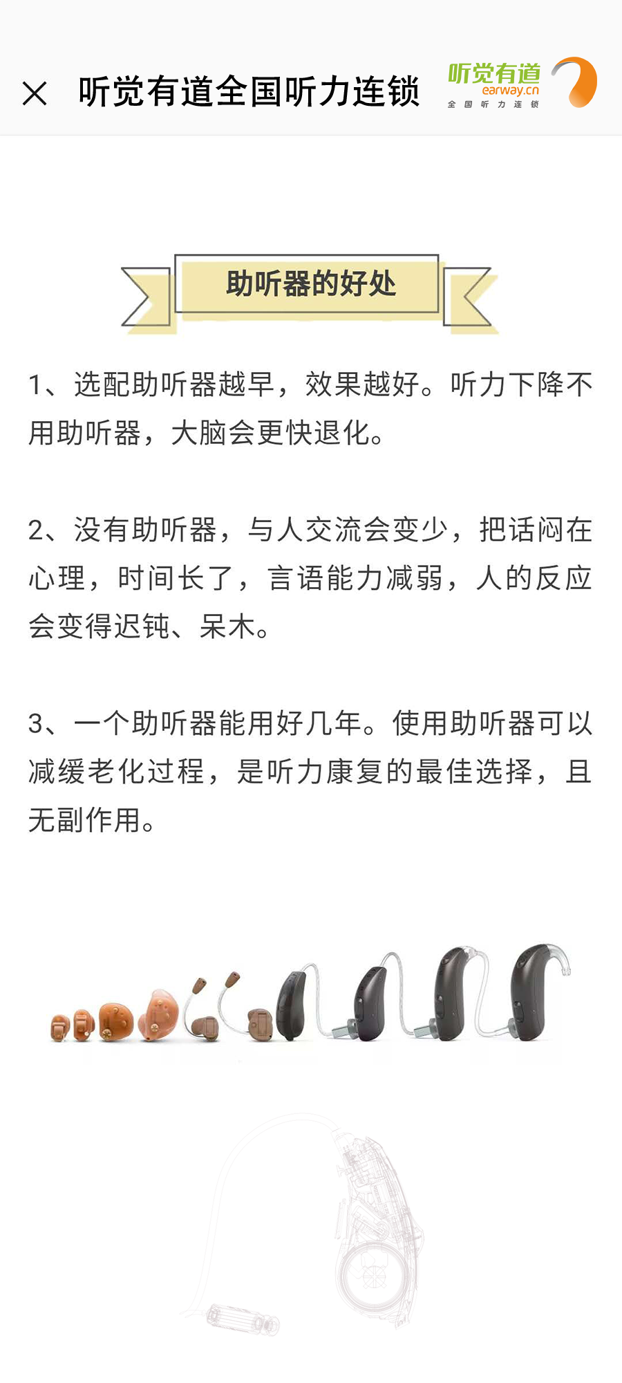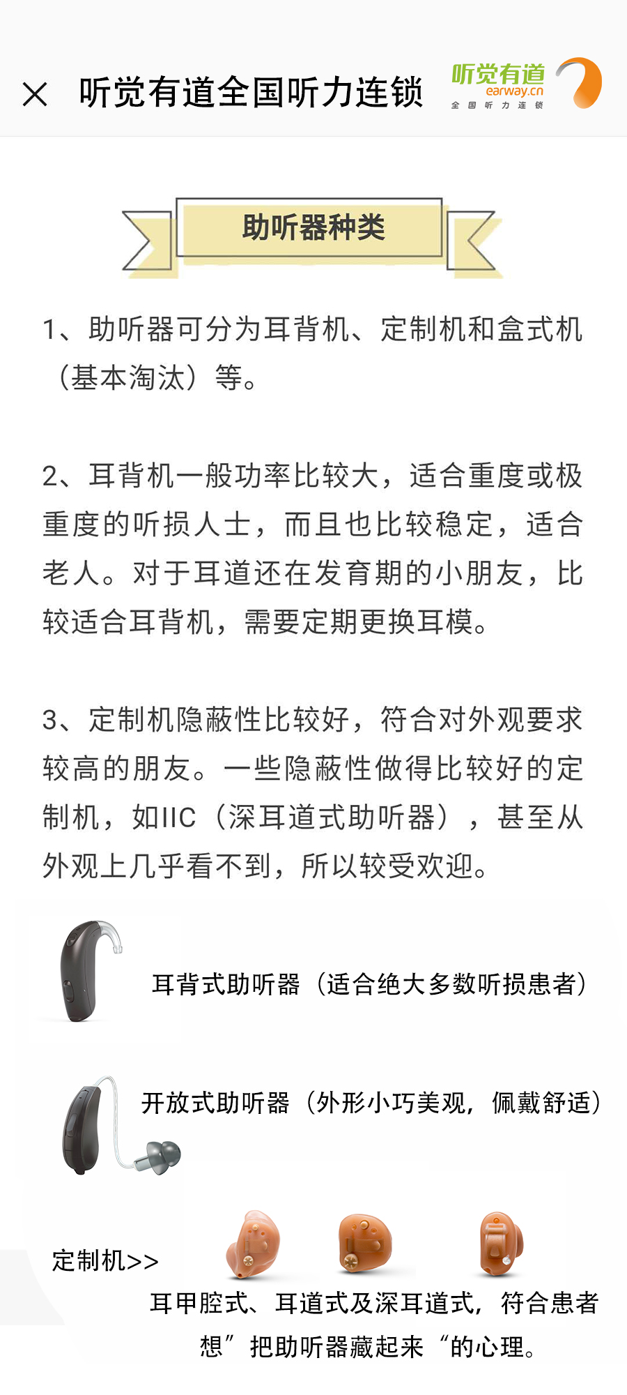 什么是助聽器?長什么樣子?有什么作用?如何使用?這里一一告訴您!</p><p> 助聽器是聽力障礙者使用的輔具,用來補足聽力損傷所造成的缺陷。廣義上講凡能有效地把聲音傳入耳朵的各種裝置都可以看作為助聽器,狹義上講助聽器是一個電聲放大器,通過它將聲音放大,使聽障者聽到了原來聽不清楚、聽不到的聲音。</p><p> 第一:助聽器的種類</p><p style="text-align: center;"><img src="/upfiles/201901180318143583.jpg" width="640" alt="" /><br /></p><p> 第二:助聽器的好處</p><p style="text-align: center;"><img src="/upfiles/201901180318334139.png" width="640" alt="" /><br /></p><p> 第三:如何適應助聽器</p><p style="text-align: center;"><img src="/upfiles/201901180318506440.jpg" width="640" alt="" /><br /></p><p> 第四:選配助聽器流程</p><p style="text-align: center;"><img src="/upfiles/201901180319039646.jpg" width="640" alt="" /><br /></p><p style="text-align: center;"><br /></p><p> 更多詳情請登錄m.cqzzjd.cn</p>" />