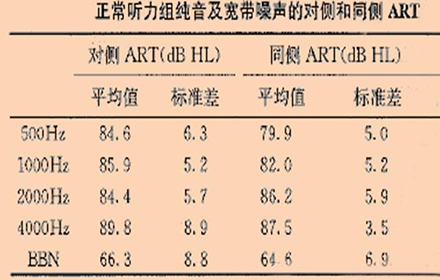 聲反射閾(ART)指的是能引起聲反射的最小刺激聲強度,也就是指能引起鐙骨肌收縮的最小刺激聲強度。臨床上通常采用500、1000、2000Hz的純音作為刺激聲,有時也用寬帶噪聲。通過大量的研究,聲反射閾的正常值范圍已經建立:當刺激信號為純音時,正常值為85~100dBSPL,比寬帶噪聲大約低20dB。