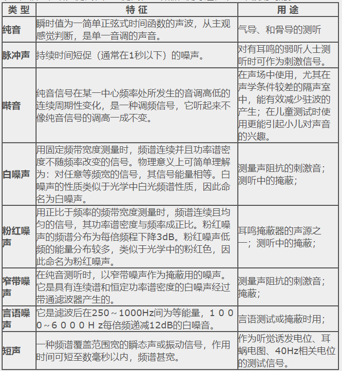 1. 描述聲波的常見物理量</p><p> 1)頻率:?jiǎn)挝粫r(shí)間內(nèi)物體振動(dòng)的次數(shù)(次/秒),用Hz表示;</p><p> 2)強(qiáng)度和振幅:振幅是描述物體振動(dòng)時(shí)傳遞能量的大小,單位是分貝dB;</p><p> 3)分貝:人耳的聽聲范圍太大,引起聽閾的最小聲強(qiáng)與引起痛覺的最小聲強(qiáng)相差近100萬倍,不易計(jì)數(shù),因此以某一絕對(duì)聲強(qiáng)為基準(zhǔn)(20μPa),將聲強(qiáng)的絕對(duì)值轉(zhuǎn)換為與該基準(zhǔn)聲強(qiáng)的比值(聲強(qiáng)的級(jí)),再取以10為底的對(duì)數(shù),最終計(jì)數(shù)單位變成了貝爾(Bell),為了更細(xì)的分級(jí),現(xiàn)在普遍采用1/10B,即分貝(dB)為計(jì)數(shù)單位。</p><p> </p><center><img alt="" src="/upfiles/201906100126248309.png" width="423" height="154" /></center><p></p><p style="text-align: center;">音波示意圖</p><p style="text-align: left;"> 4)相位:指聲源相對(duì)于聽者的方向或位置,當(dāng)頻率相同的聲音同時(shí)到達(dá)某點(diǎn)時(shí),如果相位相同,其結(jié)果是使聲音顯得更響;當(dāng)聲音一前一后分別到達(dá)時(shí),相位出現(xiàn)部分抵消,其結(jié)果是使聲音顯得更輕,相位是確定聲源位置的依據(jù);</p><p> 5)聲壓級(jí)(SPL):是用對(duì)數(shù)級(jí)的辦法來表示聲壓的相對(duì)大小,單位是dB SPL。計(jì)算公式為L(zhǎng)p(SPL)=20lg(P/P0),P0為基準(zhǔn)聲壓,在空氣中取人耳1000Hz處能聽到的最小聲壓20μPa。</p><p> 2. 聽力學(xué)中常用的聲音信號(hào)</p><p> 下列聲信號(hào)在聽力測(cè)試、聲場(chǎng)測(cè)試、助聽器檢測(cè)等過程中經(jīng)常被用到的。</p><p> </p><center><img alt="" src="/upfiles/201906100126317113.png" width="554" height="600" /></center><p></p><p> 更多詳情請(qǐng)登錄聽覺有道助聽器m.cqzzjd.cn</p>" />