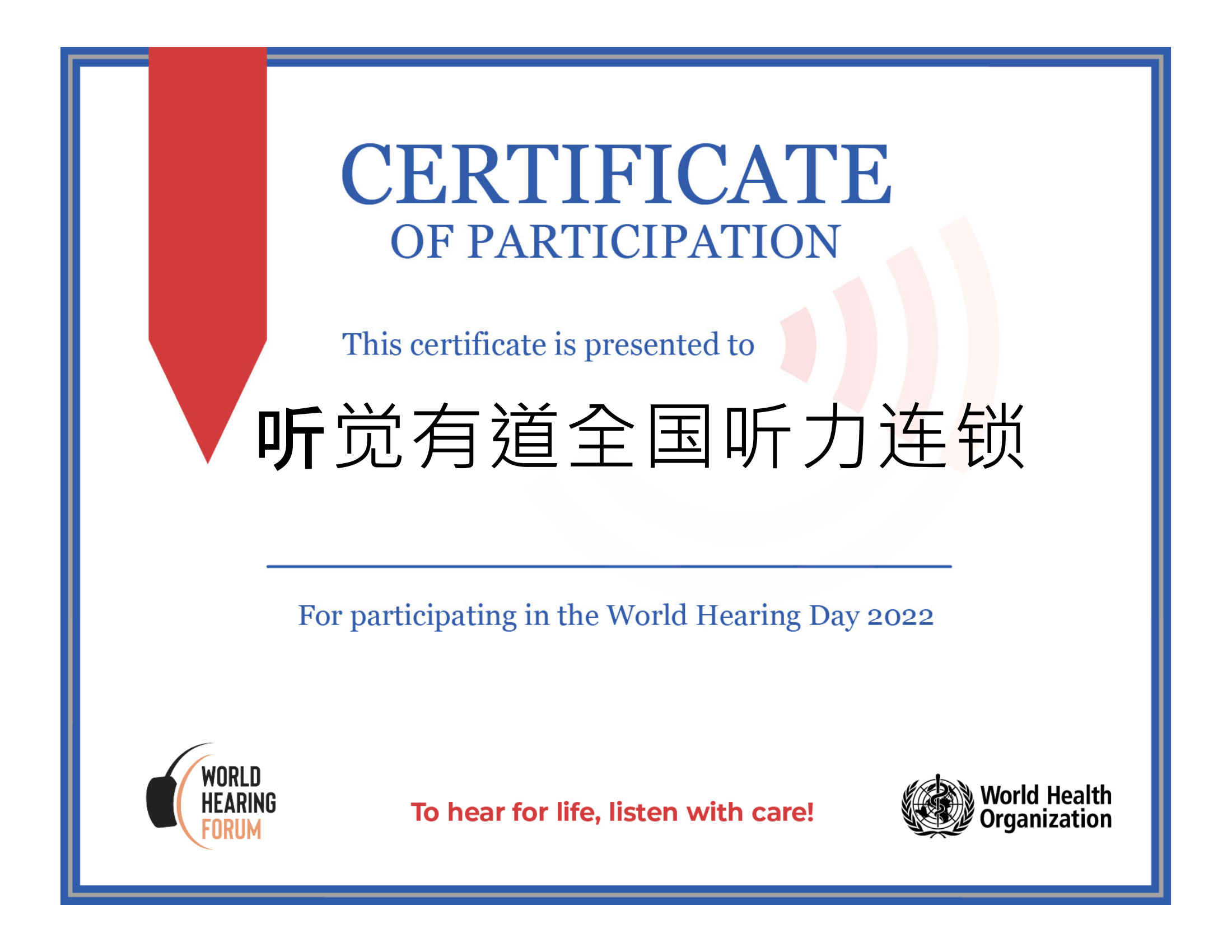 <span style="white-space:pre"> </span>每年3月3日,是世界聽力日,也是全國愛耳日。<br /><br /> WHO(世界衛(wèi)生組織)對(duì)聽覺有道全國聽力連鎖在世界聽力日活動(dòng)中所作出的努力,給予充分肯定,并于5月10日授予榮譽(yù)證書。<br /><br /> 2022年3月,聽覺有道在全國范圍開展大規(guī)模的愛耳護(hù)耳宣傳科普活動(dòng)。<br /><br /></span><p><span style="font-size:16px;"> 我們的專業(yè)助聽器驗(yàn)配師不遺余力,為當(dāng)?shù)鼐用駲z查聽力、宣傳聽力知識(shí)、提供聽力解決方案和選配助聽器。</span></p><p style="text-align: center;"><span style="font-size:16px;"><img src="http://m.cqzzjd.cn/upfiles/202205111115147752.png" width="640" style="font-size:16px;" alt="" /><br /></span></p><p><span style="font-size:16px;"> 關(guān)愛聽力健康,聆聽精彩未來!聽覺有道一直在行動(dòng)。</span></p><p><span style="font-size:16px;"><br /></span></p><p><br /></p>" />